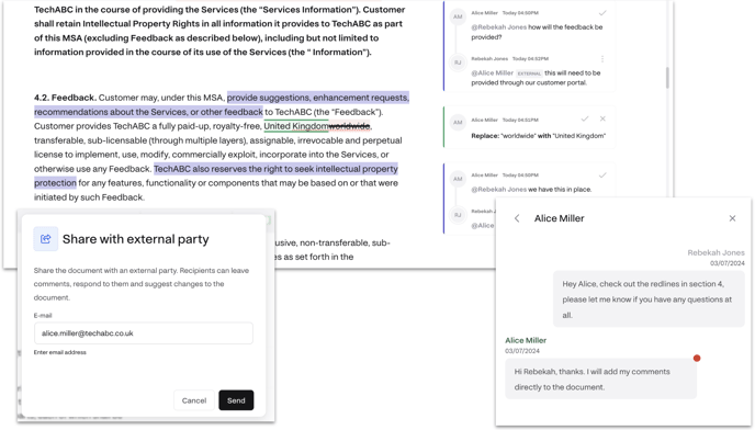 This streamlined process ensures that all communication and collaboration regarding the contract are centralised in one location, making it easier to track and manage feedback. Additionally, by limiting the third party's capabilities to making suggestions and comments only, you retain full control over the document. This means that no changes can be made without your approval, providing a secure and efficient way to review and negotiate contracts.